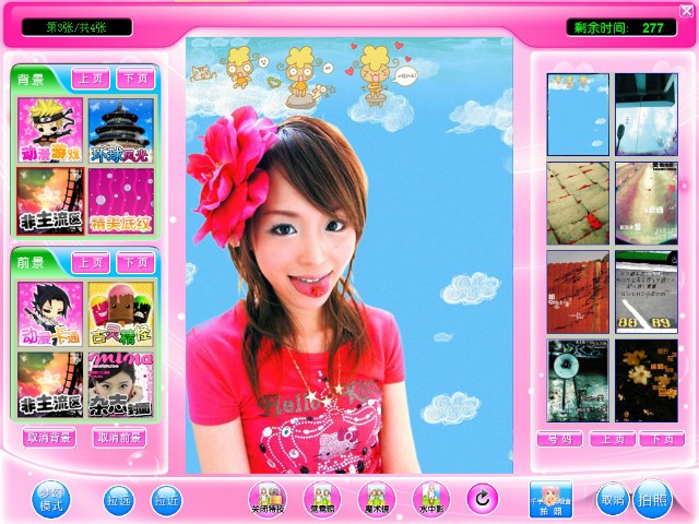 在拍照時(shí),可在主界面左側(cè)的背景和前景類別框選擇圖片類別,此時(shí)主界面右邊會(huì)出現(xiàn)所選類別圖片的縮略圖,選擇喜歡的背景或前景圖片。