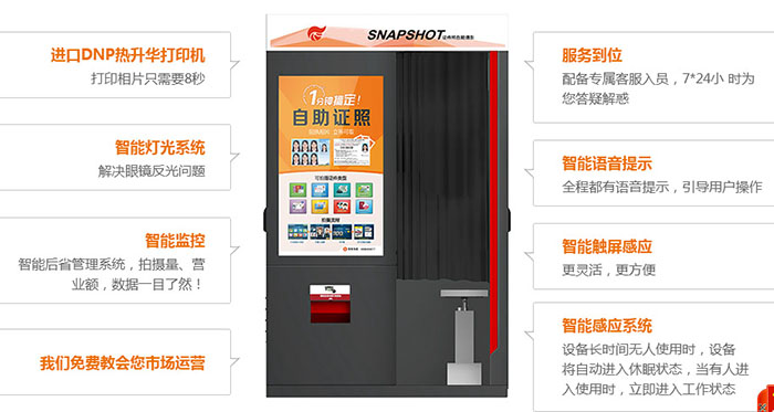 2、自助式證件照攝影系統是全自動運行的,24小時工作,無需有人值守,用戶可以自主完成照片的拍攝、指紋采集、繳費、照片打印,可以使用現金、支付寶、微信、銀聯進行繳費。自助式證件照攝影系統操作簡單,全程都有語言提示。
