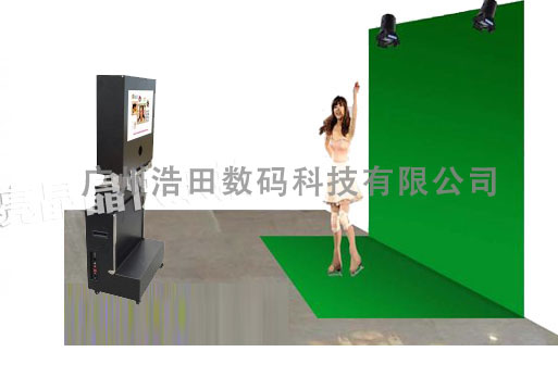 1.人站在自助拍照機前方,界面顯示背景和人像,做好合適的POSE