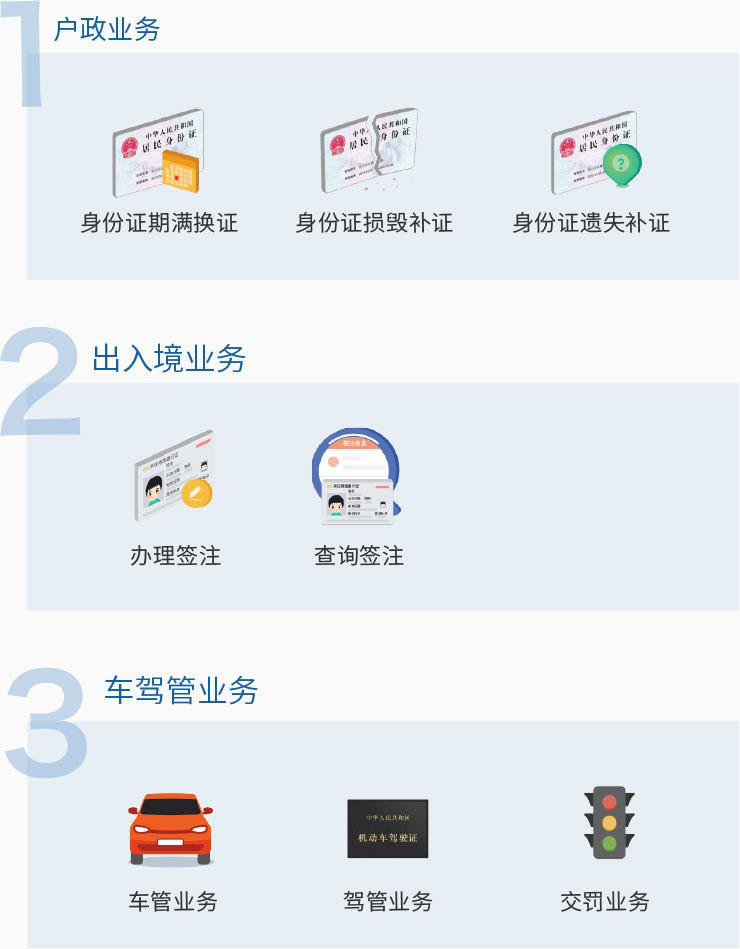 可自助辦理證件照拍攝、居住證業(yè)務(wù)、身份證補(bǔ)換領(lǐng)業(yè)務(wù)、駕駛證、行駛證查詢(xún)、違法信息查詢(xún)及其他業(yè)務(wù)辦理、港澳簽注業(yè)務(wù)辦理。